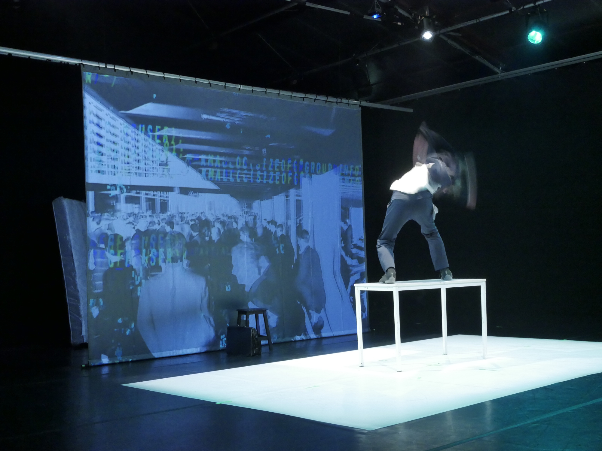 Error 404 est la première création de Eliott Pineau-Orcier, jeune artiste situé à la confluence du cirque, de l’acrobatie, de la danse, de la comédie, de l’ombre chinoise, du mime.
