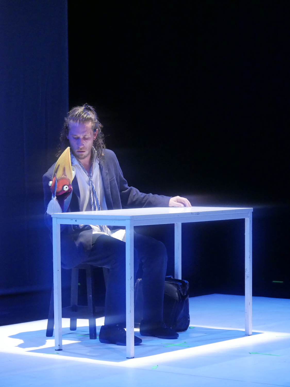 Marionnettiste d’un jour, il est acculé par sa créature diabolique à sa misérable condition humaine. Promu businessman, son cartable a des velléités de rébellion.